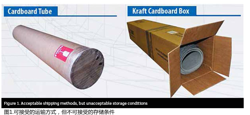 請注意,特別是對于彈性體粘合纖維片材,盡管盒子和紙管是經(jīng)批準的以卷材形式運輸片材的方法,但它們不應在任何情況下用作長期存放(參見圖1)。